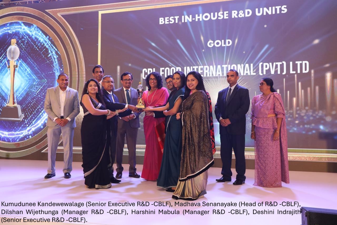 Colombo, Sri Lanka – 25th March 2025 – CBL Foods International (Pvt) Ltd. (CBLF), a subsidiary of CBL Group, was awarded Gold for Best In-House Research and Development Unit at the National Industry Brand Excellence Awards, organised by the Industrial Development Board (IDB), for its exemplary performance and commitment demonstrated in driving innovative solutions and technological advancements that significantly contribute to the expansion of research and development capacity in Sri Lanka.